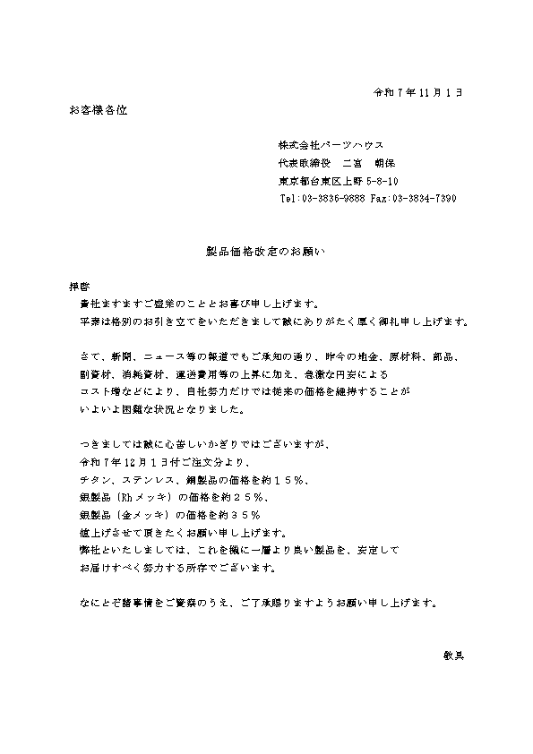 2019.11.19「銀製品価格改定のお知らせ」UPいたしました